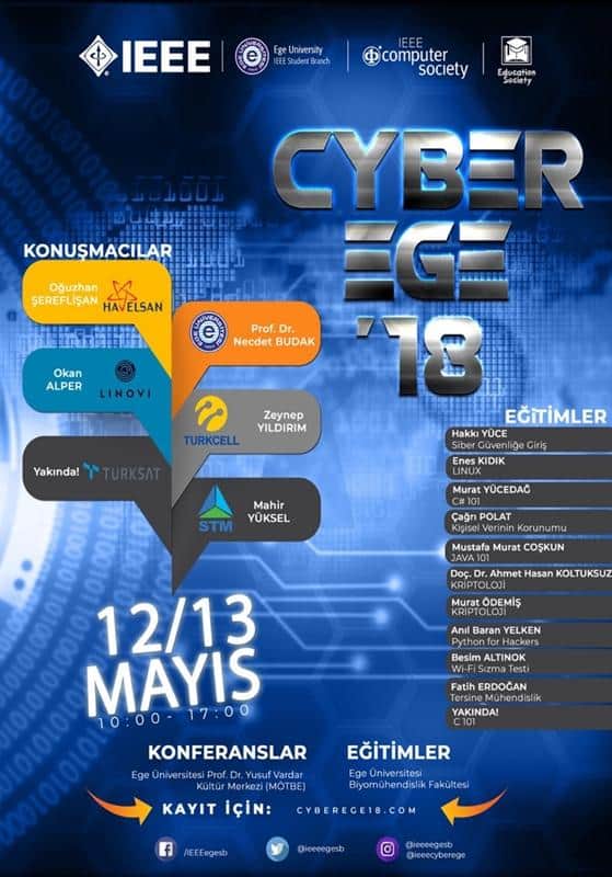 CyberEge Ege Üniversitesi’nde gerçekleşecek. İlki 2016 yılında düzenlenmiş olan İzmir’in ilk büyük siber güvenlik konferansı CyberEge’18, 12-13 Mayıs…