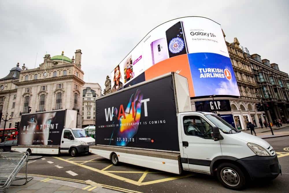 Huawei tanıtım lansmanı öncesinde, İngiltere’de bulunan Samsung ve Apple mağazalarının önüne tanıtım kamyonu çekip ilginç bir reklam kampanyası…