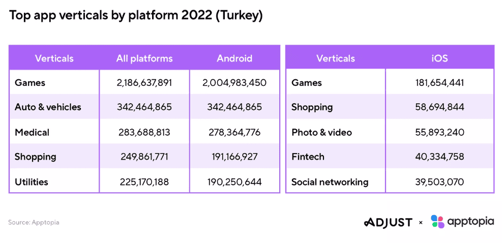 Otomobil ve araç uygulamaları 342 milyon indirme ile ikinci sırada yer alırken, tıbbi uygulamalar üçüncü sırada yer aldı. iOS’ta en iyi performans gösteren dikeyler farklıydı; alışveriş ikinci sırada yer alırken onu fotoğraf ve video, fintech ve sosyal ağ uygulamaları takip etti.