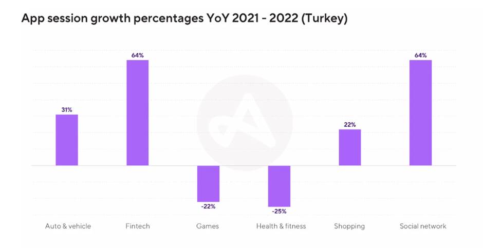 Özellikle 2023’ün ilk yarısında uygulama performansının umut verici olduğu ve yüklemelerin 2022 ortalamasına kıyasla %5 arttığı görülüyor. Genel oturumlar bu yıl biraz azalırken, fintech, alışveriş ve sosyal ağ gibi dikeyler önemli ölçüde büyüdü.