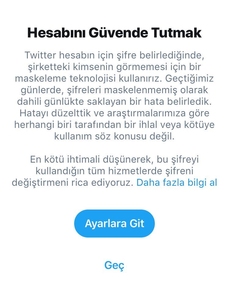 “Twitter hesabın için şifre belirlediğinde, şirketteki kimsenin görmemesi için bir maskeleme teknolojisi kullanırız. Geçtiğimiz günlerde, şifreleri maskelenmemiş olarak dahili günlükte saklayan bir hata belirledik. Hatayı düzelttik ve araştırmalarımıza göre herhangi biri tarafından bir ihlal veya kötüye kullanım söz konusu değil. En kötü ihtimali düşünerek, bu şifreyi kulladığın tüm hizmetlerde şifreni değiştirmeni rica ediyoruz.”