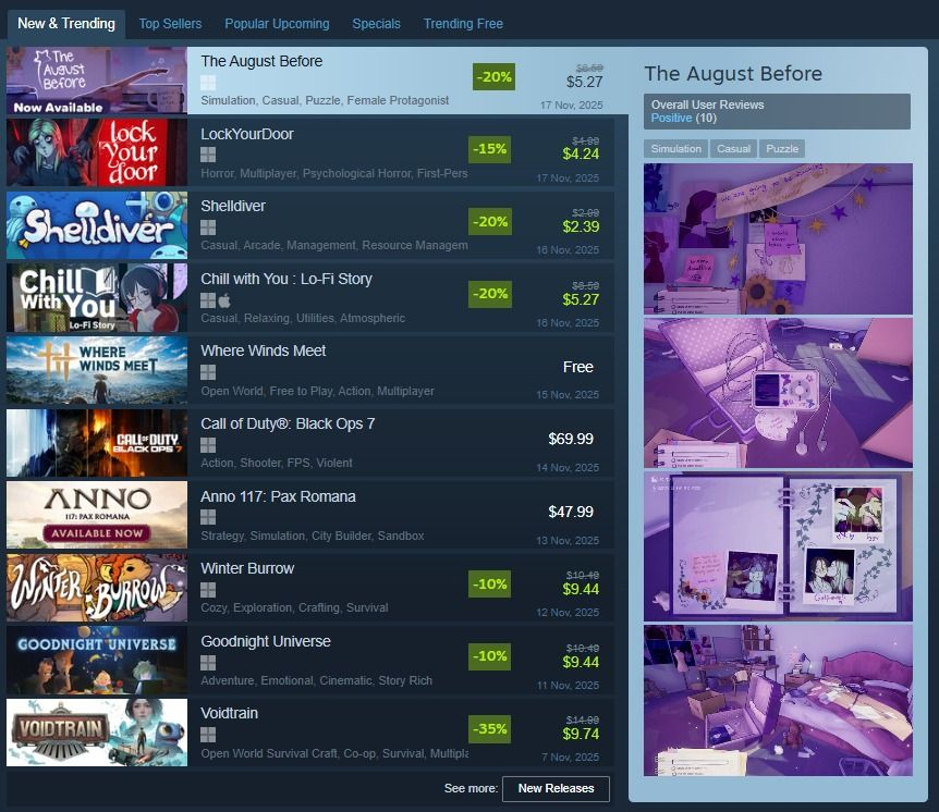 Catoptric Games’in yayıncılığını yaptığı ve 34.000 wishlist toplamayı başaran The August Before aynı başarıyı gösterirken bir yandan da gün içerisinde New & Trending sayfasında da yer aldı.